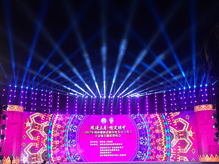 今晚(農(nóng)歷三月初三),由海南省人民政府主辦,海南省民族宗教事務(wù)委員會、海南省文化廣電出版體育廳、海南省旅游發(fā)展委員會、海南省商務(wù)廳、瓊中黎族苗族自治縣人民政府承辦,以“浪漫三月·情定瓊中”為主題的2017年海南黎族苗族傳統(tǒng)節(jié)日三月三主會場活動在瓊中三月三廣場隆重開幕。浩洋電子自主研發(fā)特寶麗品牌近500臺高品質(zhì)專業(yè)舞臺燈光產(chǎn)品:全能王三合一G9 HYBRID、切割燈V3000P、光束燈G9B、染色燈V1500TW、大光束燈V1500TB、防水固定染色燈OVAL 60D等炫耀擔(dān)任瓊中主會場舞臺燈光主力,為今年海南“三月三”民俗節(jié)慶晚會傾力獻(xiàn)力。