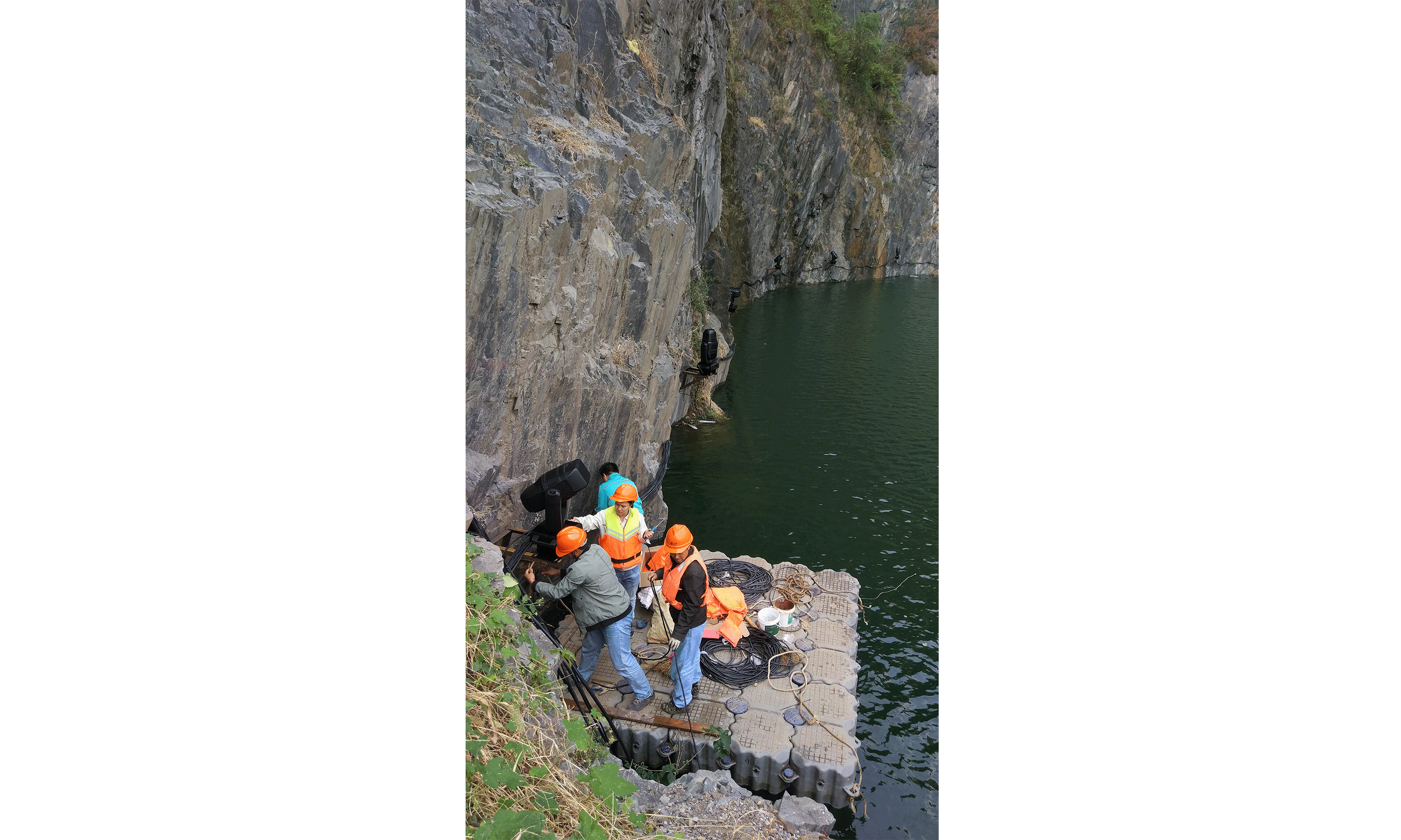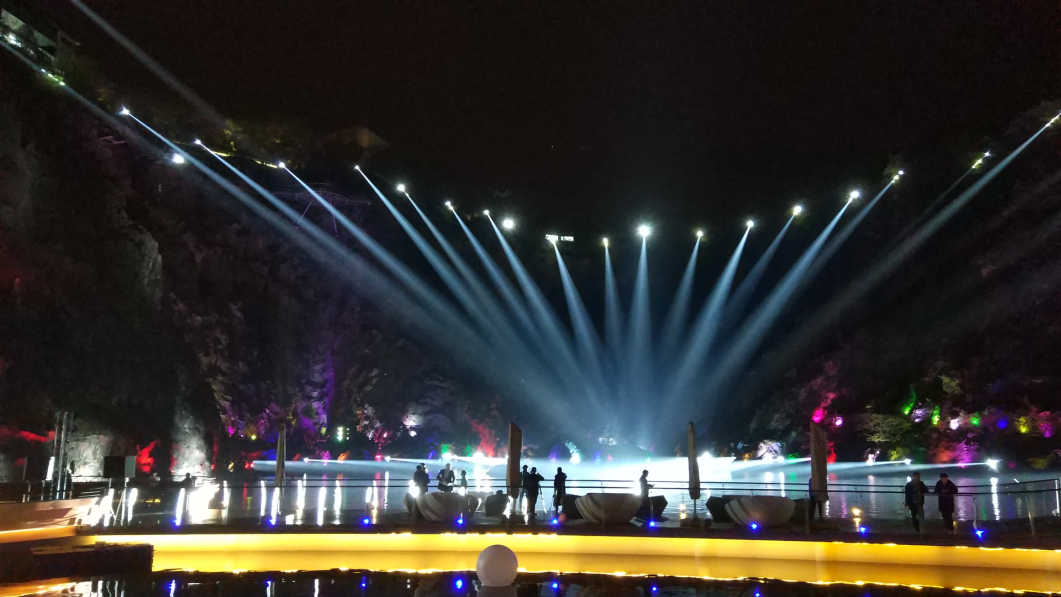酒店沿崖壁而建,面向橫山,戶外工程環(huán)境復(fù)雜,其深坑巖壁的曲面造型,致使燈具懸崖運(yùn)輸,特別是位于崖壁下的安裝工程,由于地理環(huán)境的限制,無法采取常規(guī)施工技術(shù)方案,為浩洋工程部增加了極大的工程施工難度。但我們的團(tuán)隊(duì)并沒有氣餒,而是迎難而上,在確保高工藝水準(zhǔn)的情況下,以專業(yè)的工程專業(yè)技術(shù)能力和高度負(fù)責(zé)的態(tài)度,針對(duì)本項(xiàng)目特殊地勢(shì)制定專門的施工方案,克服了大范圍水上作業(yè)、高空懸崖作業(yè)安裝等重重困難,最終如期、高質(zhì)量的完成項(xiàng)目。另外,浩洋的團(tuán)隊(duì)除了承擔(dān)燈光設(shè)備的安裝工作外,還積極參與整體控制系統(tǒng)的融合、同步控制工作,保證了總導(dǎo)演的設(shè)計(jì)理念得以完美實(shí)現(xiàn),打造出一場(chǎng)震憾的、聚集各種創(chuàng)意視覺的的奇境光影水秀。