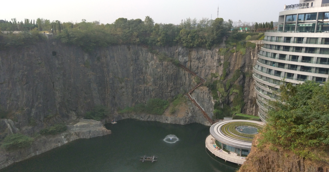 上海佘山世貿(mào)洲際酒店(又名“世茂深坑酒店”),位于上海松江國(guó)家風(fēng)景區(qū)佘山腳下,造價(jià)20億、耗時(shí)12年,酒店的特別之處在于它是巧奪天工在廢棄采石礦坑內(nèi)建成,深入地下88米,是至今世界海拔最低的酒店,其革命性的先鋒建筑設(shè)計(jì)已被美國(guó)國(guó)家地理頻道《世界偉大工程巡禮》評(píng)為“世界十大建筑奇跡”之一。