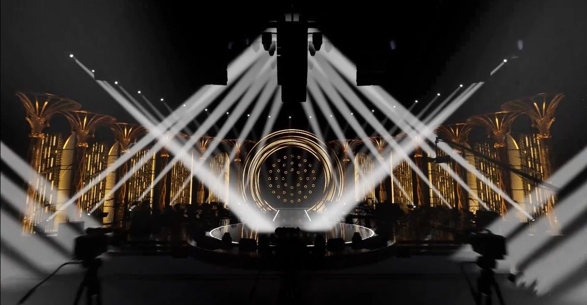 作為本季舞美的情懷加分項(xiàng),極具節(jié)目標(biāo)識(shí)性的圓環(huán)赫然矗立中央,在全新加入的流線燈光的營造下,更具超現(xiàn)代科技氛圍。而圓環(huán)兩邊,順次排開十二根金色珠光圓柱,柱體之間陳列的旋轉(zhuǎn)體則是本季創(chuàng)新的重點(diǎn)。該旋轉(zhuǎn)體分為三面,其中兩面為亞克力三角細(xì)柱,柱上貼有LED數(shù)碼條,當(dāng)歌手演唱時(shí),旋轉(zhuǎn)體可作為渲染燈光的介質(zhì),承接多種曲風(fēng)的氛圍效果;另外一面則為矩形燈陣。當(dāng)浩洋燈光亮起時(shí),貫徹了一如既往的高端視感,打造了新一輪的視覺盛宴,為觀眾帶來璀璨奪目的視覺享受。
