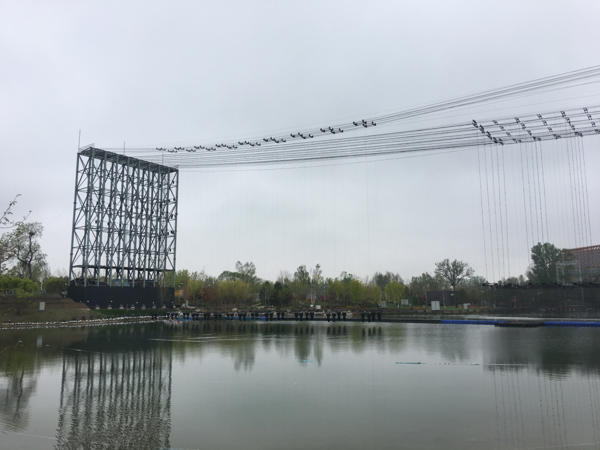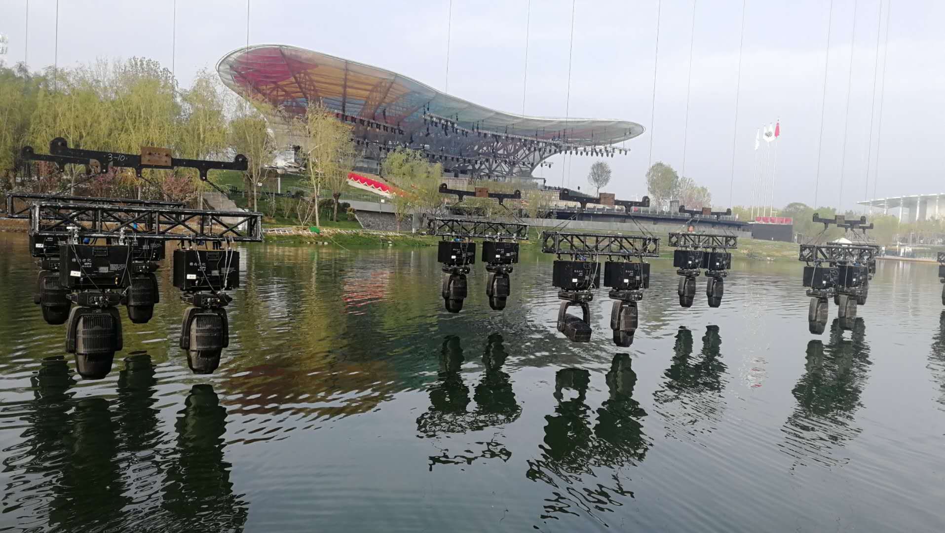 為了承載背景網(wǎng)屏和燈光設(shè)備,開(kāi)幕式專(zhuān)門(mén)臨時(shí)搭建了兩座鋼結(jié)構(gòu)威亞塔架,塔高39米,塔間跨度280米。塔間共搭設(shè)重型威亞索道16套,吊點(diǎn)總數(shù)218個(gè)。使用威亞控制系統(tǒng)將藝術(shù)空間擴(kuò)展升華,空中矩陣隱形LED屏幕、空中矩陣數(shù)控飛燈等與地面舞臺(tái)表演完美結(jié)合,給觀眾帶來(lái)超強(qiáng)的視覺(jué)震撼效果。