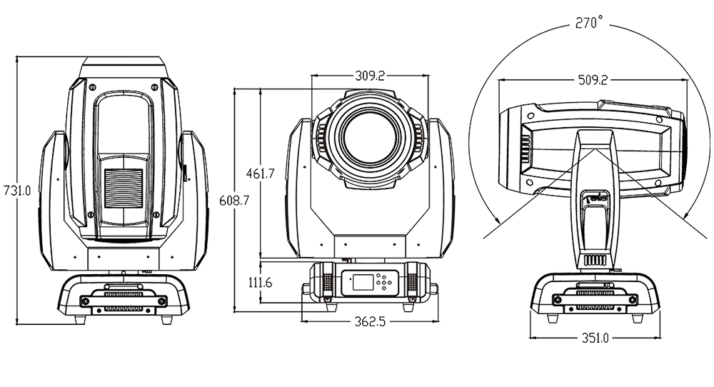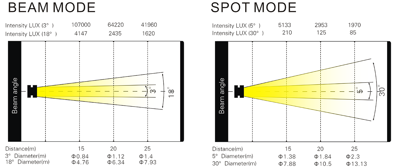 電動(dòng)放大,光束模式:3°~18°,圖案模式:5°~30°