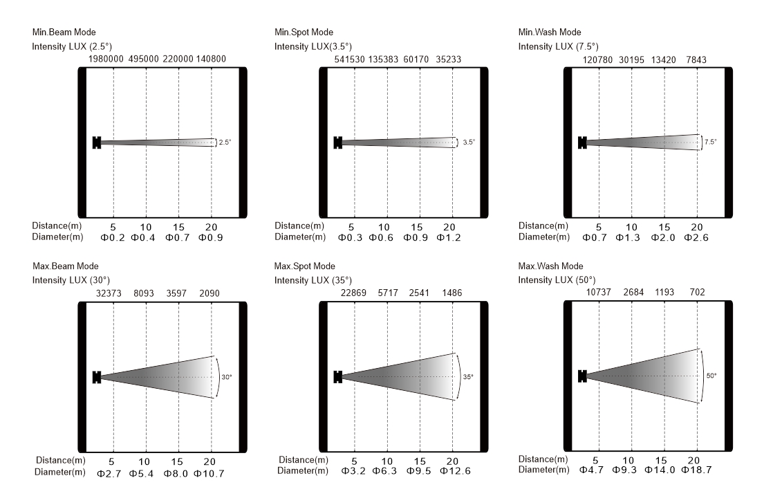 變焦范圍:光束模式:2.5°-30°,輕柔光模式:3.5°-35°,重柔光模式:7.5°-50°