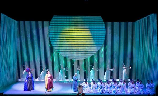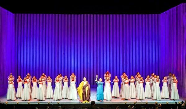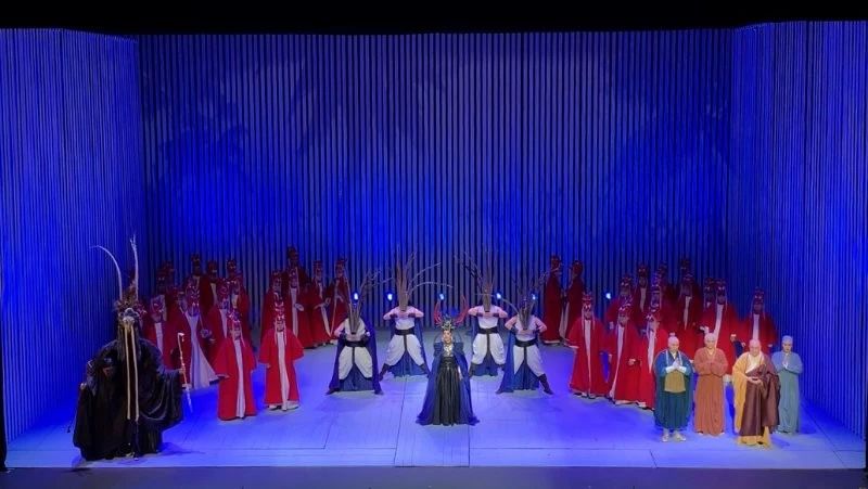 《鑒真東渡》運(yùn)用歌劇這一國際通識(shí)的藝術(shù)表達(dá)話語,配合有感染力的表演,富有創(chuàng)意的舞美燈光設(shè)計(jì),生動(dòng)、立體的人物架構(gòu),在遵循歌劇藝術(shù)規(guī)律的基礎(chǔ)上,創(chuàng)造性地將江蘇民歌元素和佛教音樂的旋律融入其中,讓歌劇更富有地域特色,呈現(xiàn)出不同于純粹西方歌劇的風(fēng)格,展現(xiàn)出東方所特有的歷史厚重感與人文風(fēng)貌。